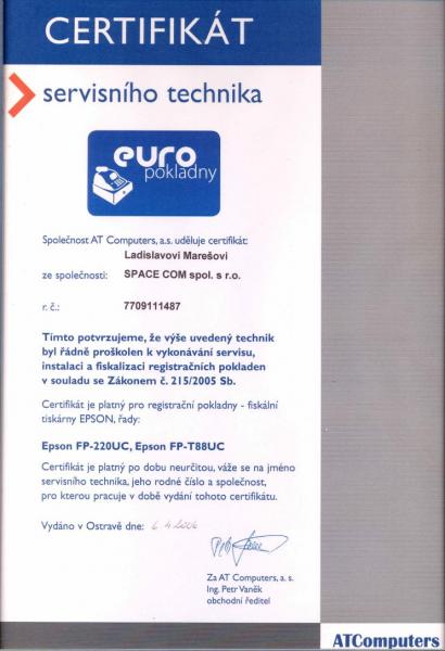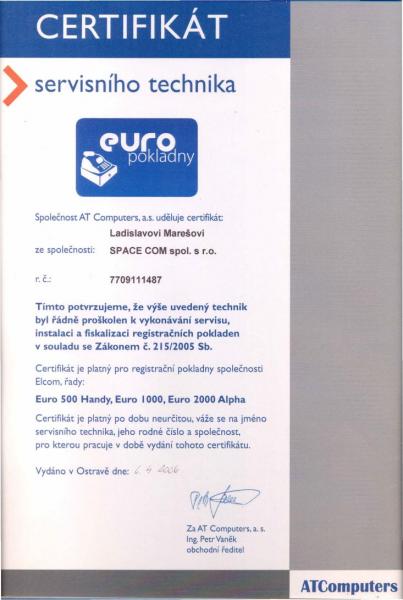 Certifikace k vykonávání servisu,instalaci a fiskalizaci registračních pokladen Euro