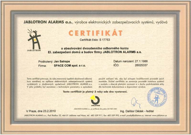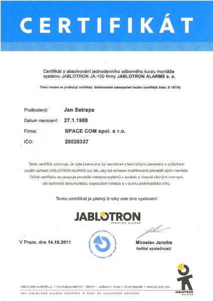 Certifikace pro montáž a realizaci EZS Jablotron