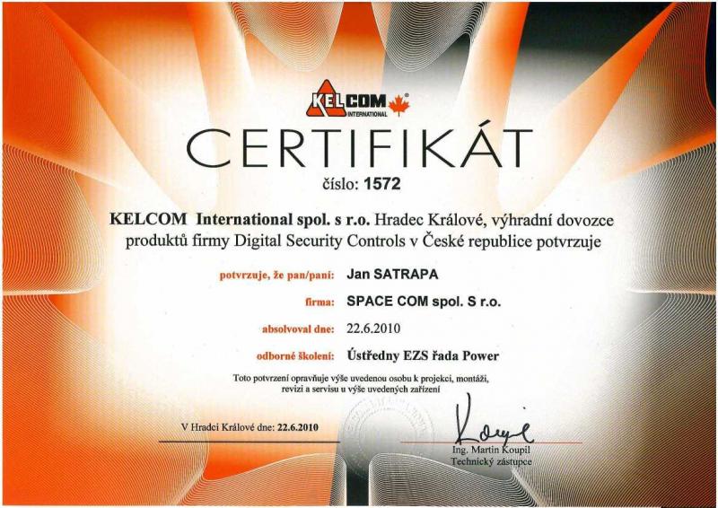 Certifikát pro projekci, montáž, revizi a servis ústředen EZS výrobce DSC. Autorizace výhradním distributorem pro ČR, společností Kelcom International spol. s r.o.